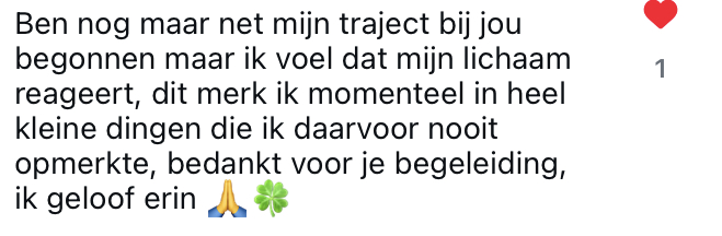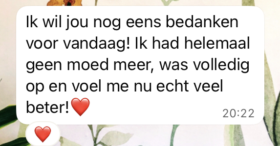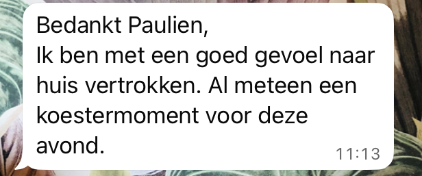 " Jarenlang was ik op zoek naar een leven zonder angst, paniek en vermoeidheid. Ik bezocht meerdere therapeuten, maar merkte amper verandering. Al snel zakte de moed terug in mijn schoenen. De gedachte 'het zal nooit meer beter worden' spookte dagelijks door mijn hoofd. Toen ik op een dag in contact kwam met Paulien, voelde ik al snel nieuwe motivatie. Ze begeleidde me al door moeilijke momenten en zorgde er telkens voor dat ik een stapje vooruit ging. Zonder Paulien had ik deze vooruitgang nooit kunnen verwezenlijken. Eindelijk terug kunnen genieten, daarvoor ben ik haar eeuwig dankbaar."